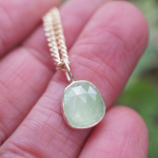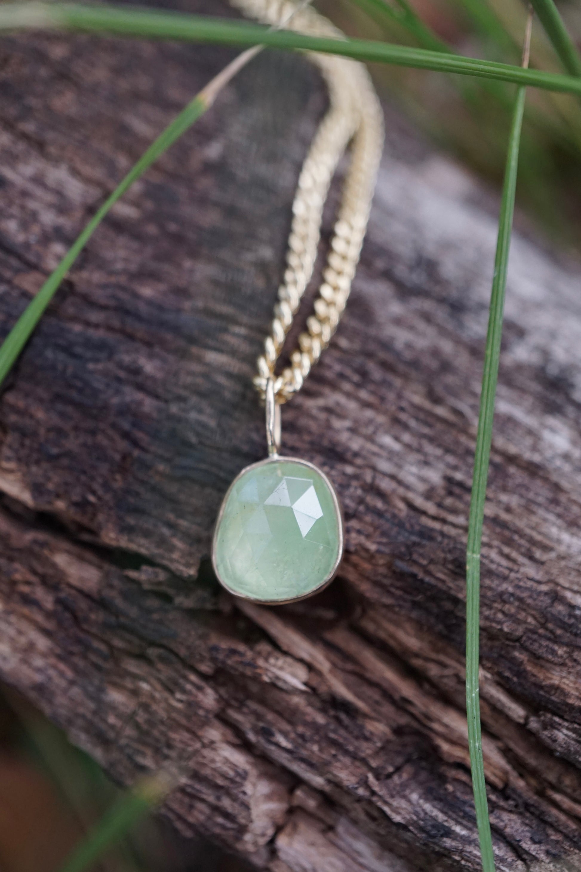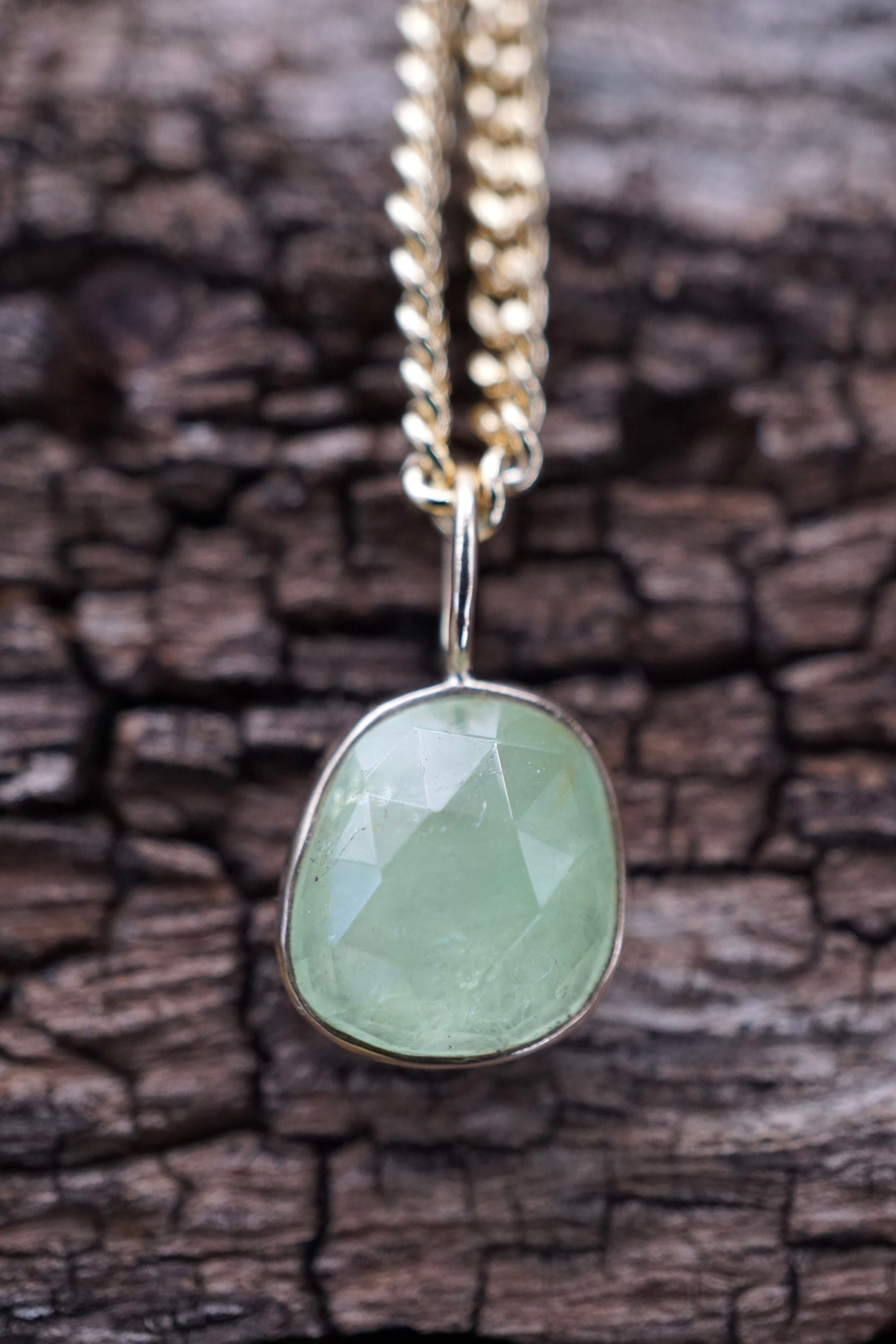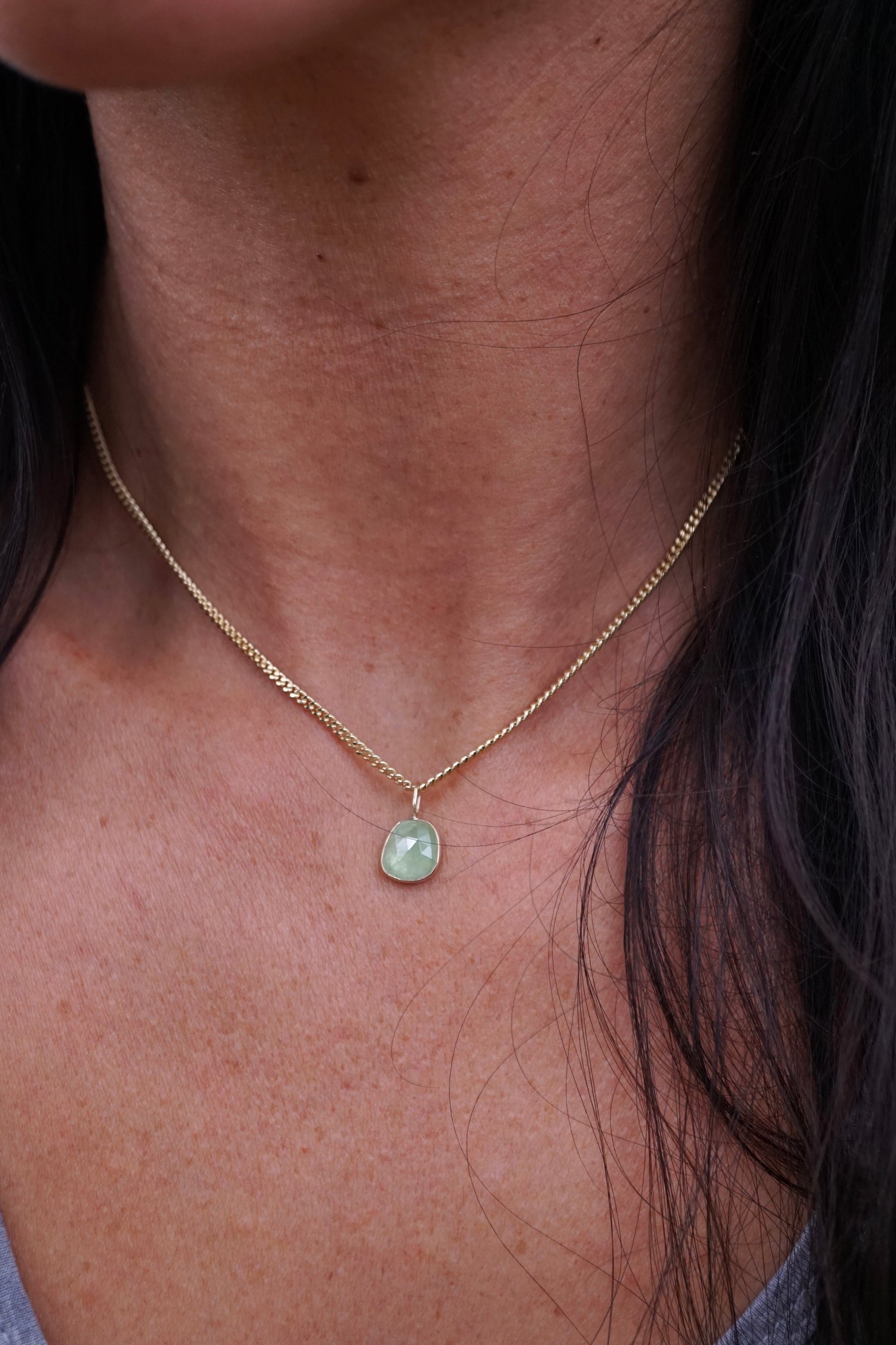 A shimmery Spring-like green garnet glows in her gold bezel. The light-catching facets make this stone sparkle with a soft light. The bezel and bail are 14k gold. The backplate behind the stone is sterling. It is hardly visible so this pendant does appear to be all gold when worn. This would make for a great layering pendant, or it is perfect on its own.