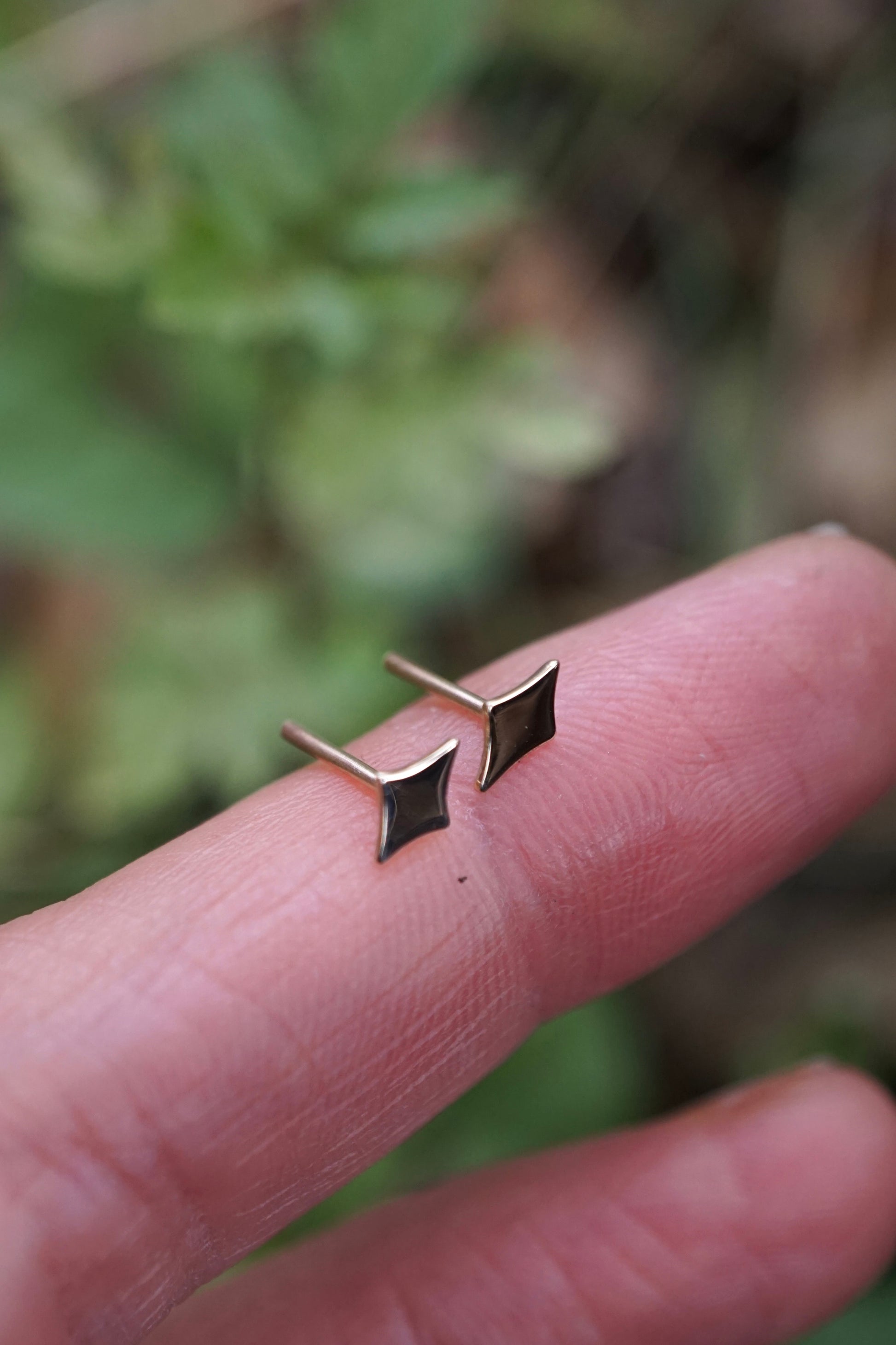 Teeny and shiny and perfect for your earrings stack or on their own. These are solid 14k reclaimed gold that I melted down and rolled out. They match but are not perfectly symmetrical. They come with tiny 14k earring backs.