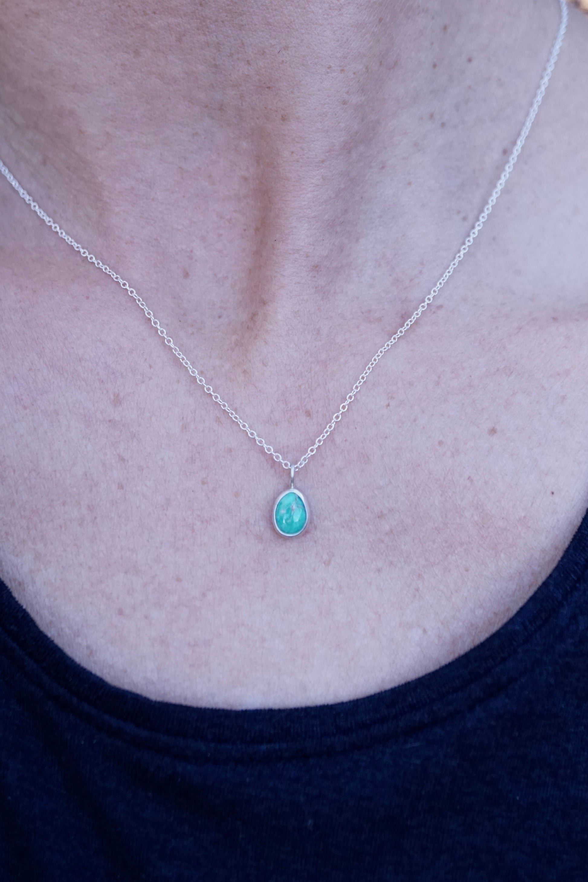 An oval of teal colored Sonoran turquoise set simply for a delicate look. Wear this necklace on its own or layer it with others. This turquoise is from Northern Mexico. Made of sterling silver.