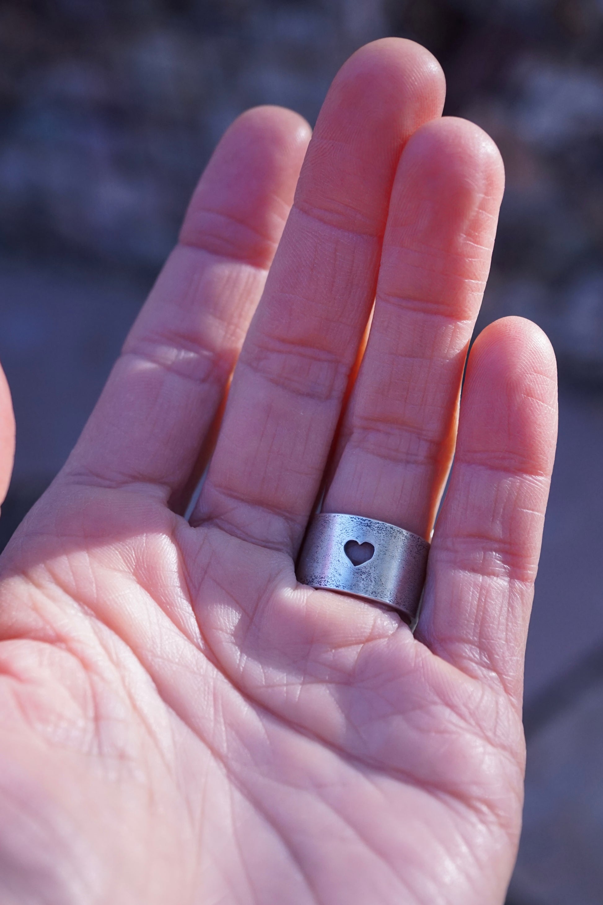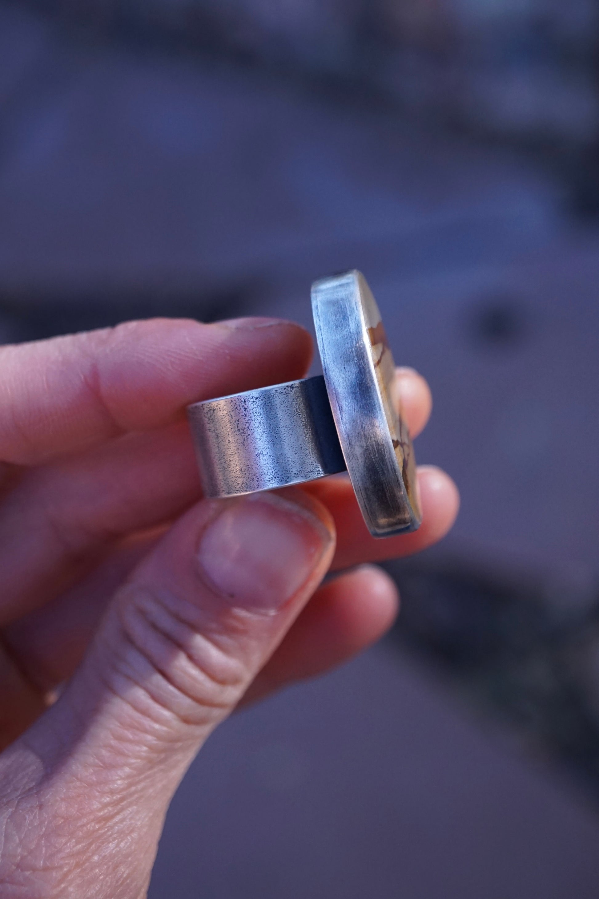 A gorgeous landscape jasper set simply in a flush silver bezel. The wide band features a cute heart window cut into the back. We always need a little more love floating around. Made of sterling silver. This is a stone I cut myself from the rough slab.