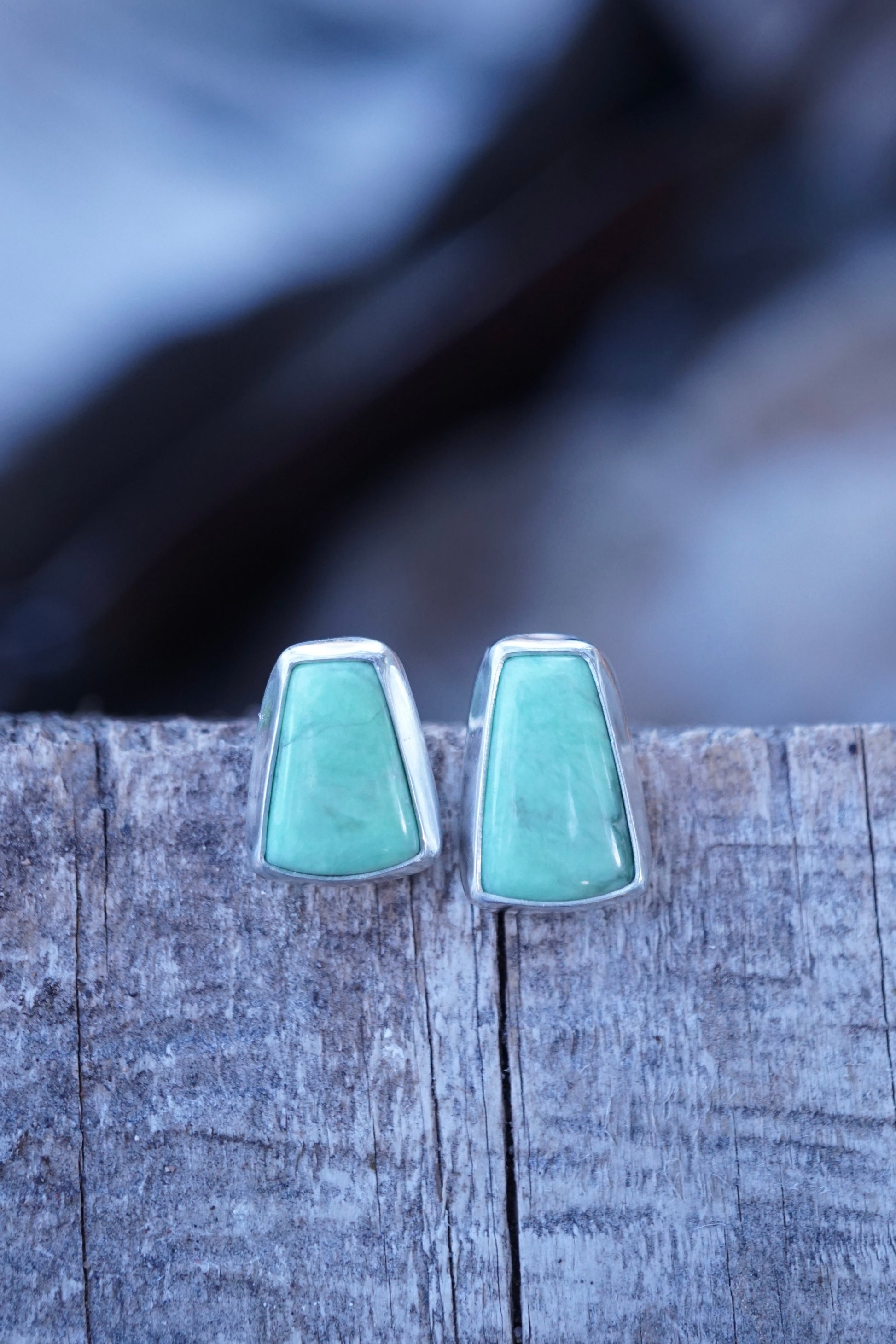 These are super sweet every day studs with minty green soft trapezoids of variscite. They are sisters not twins. Lucin Variscite is from Utah. Made of sterling silver.