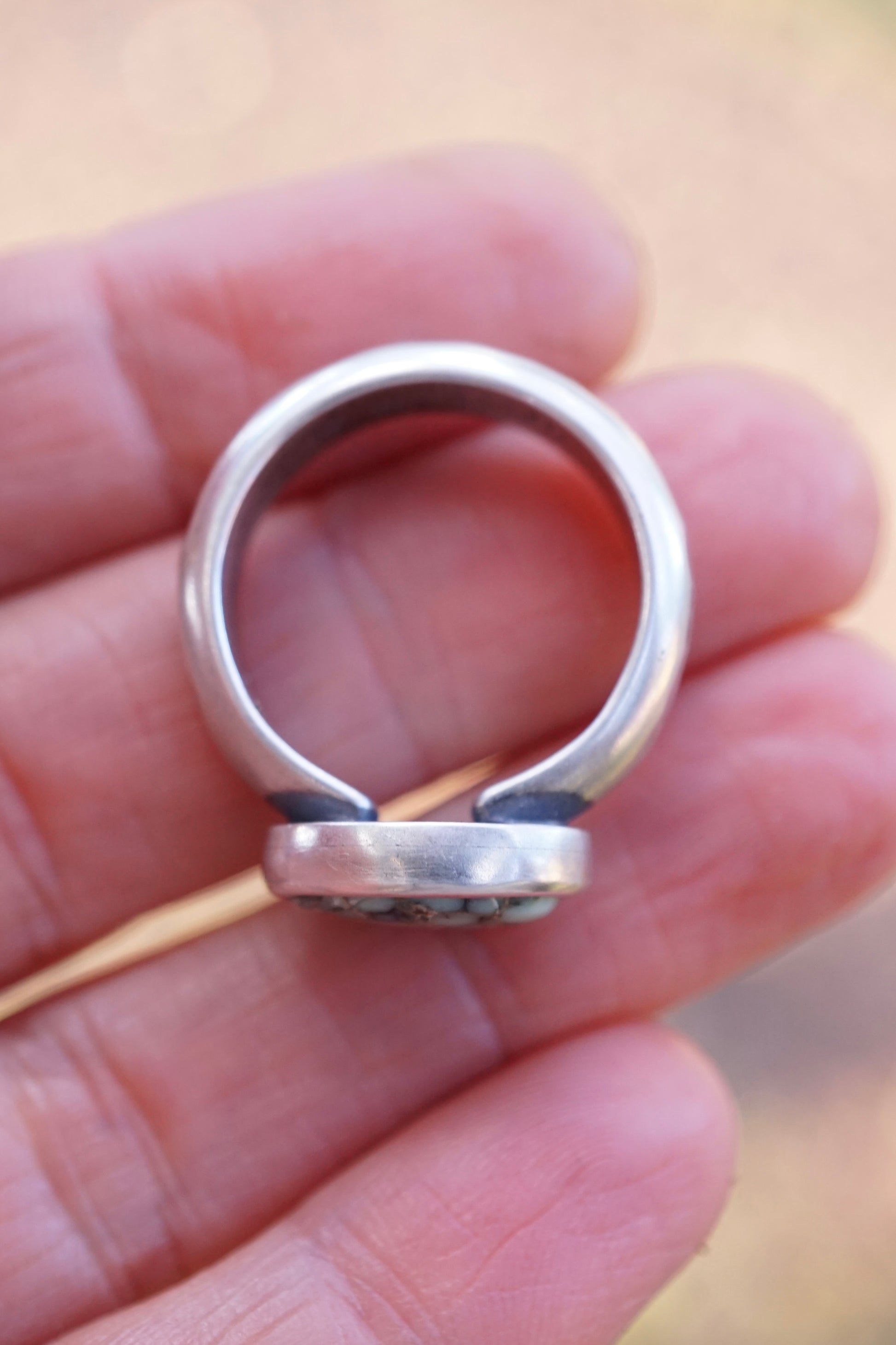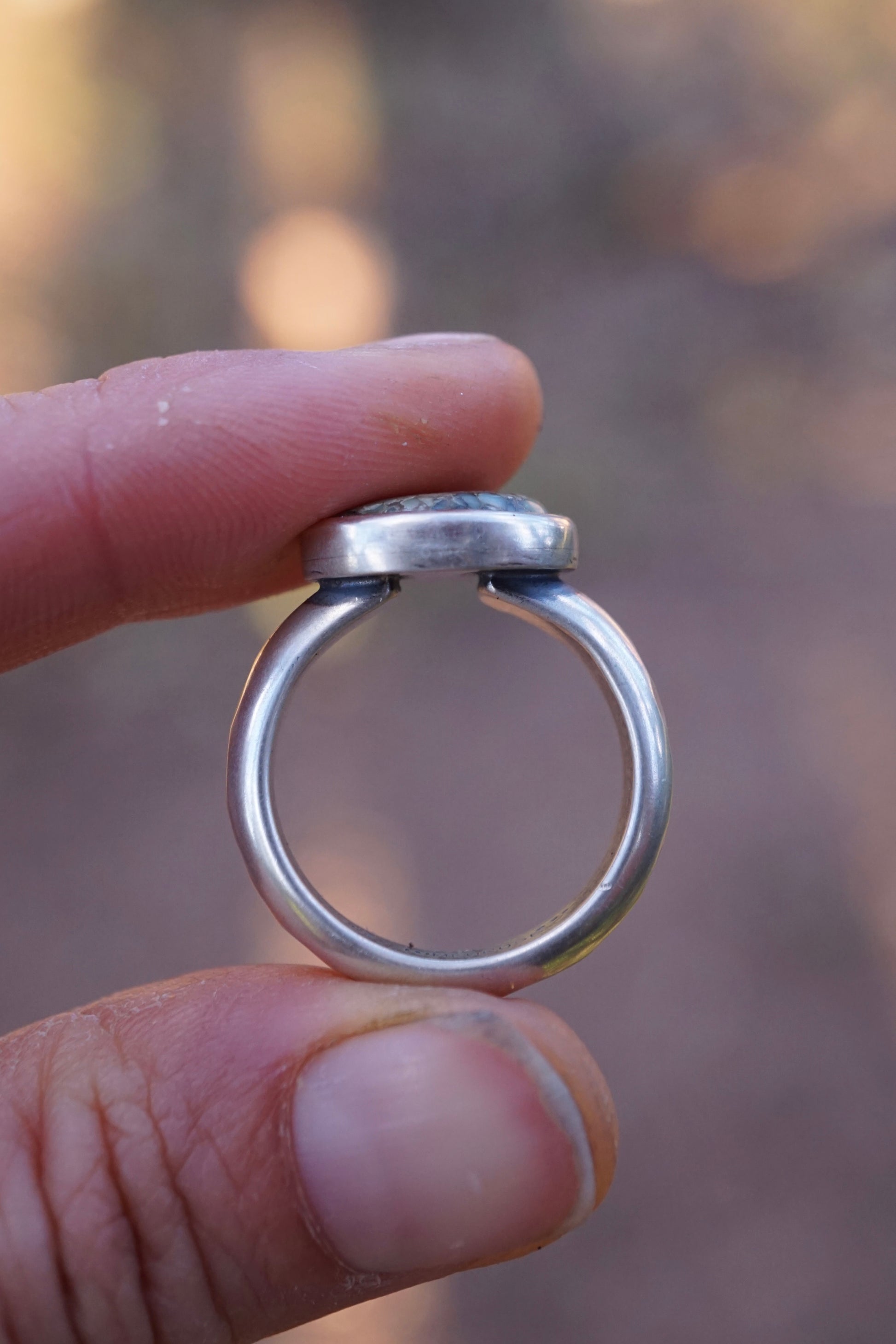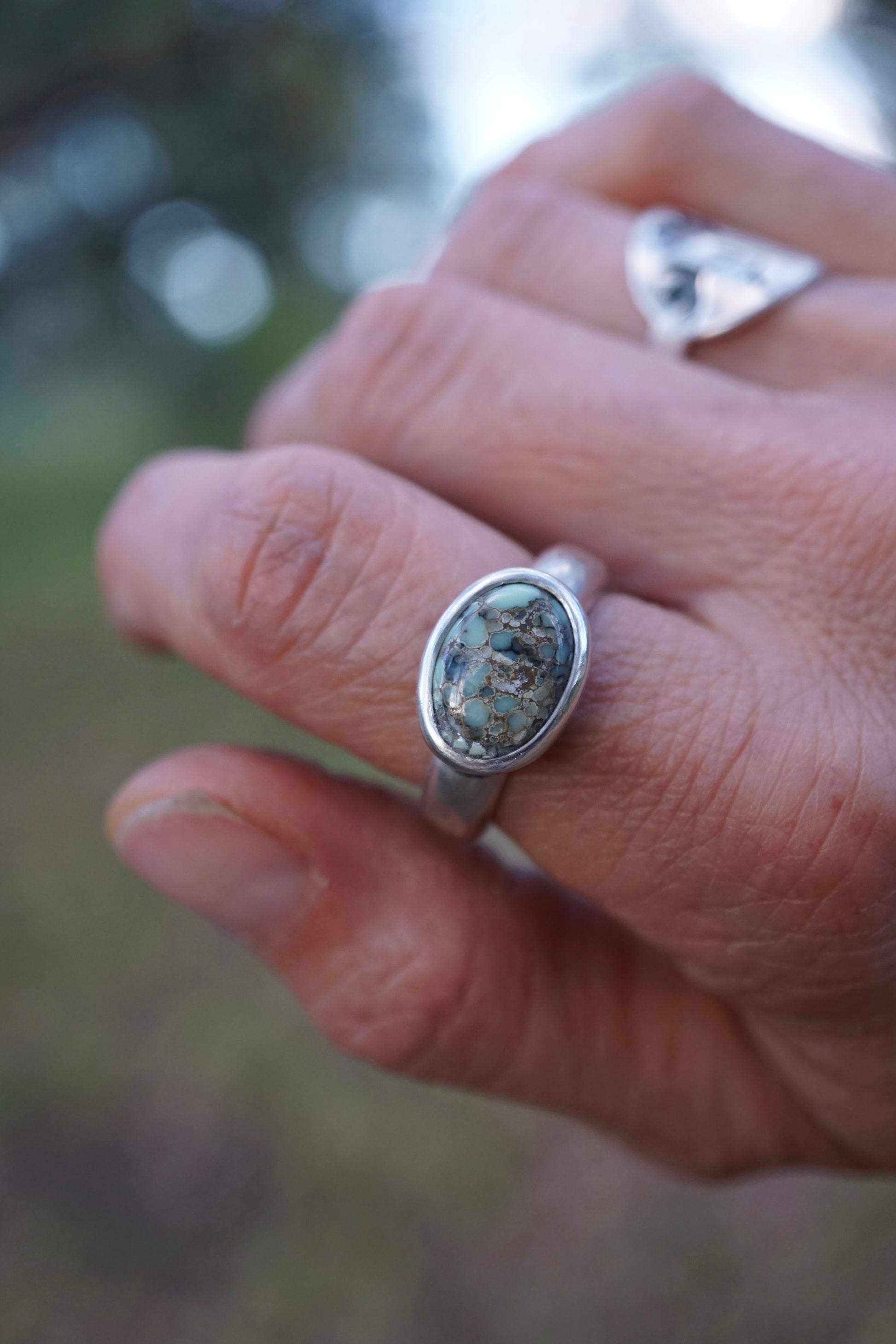 A dreamy oval of Poseidon Variscite is wrapped in a thick sterling bezel set atop a thick ring band. The band is hefty half round sterling with hammered texturing. Poseidon Variscite is from Nevada. I purchase it directly from the family who mines and cuts it. Made of sterling silver.