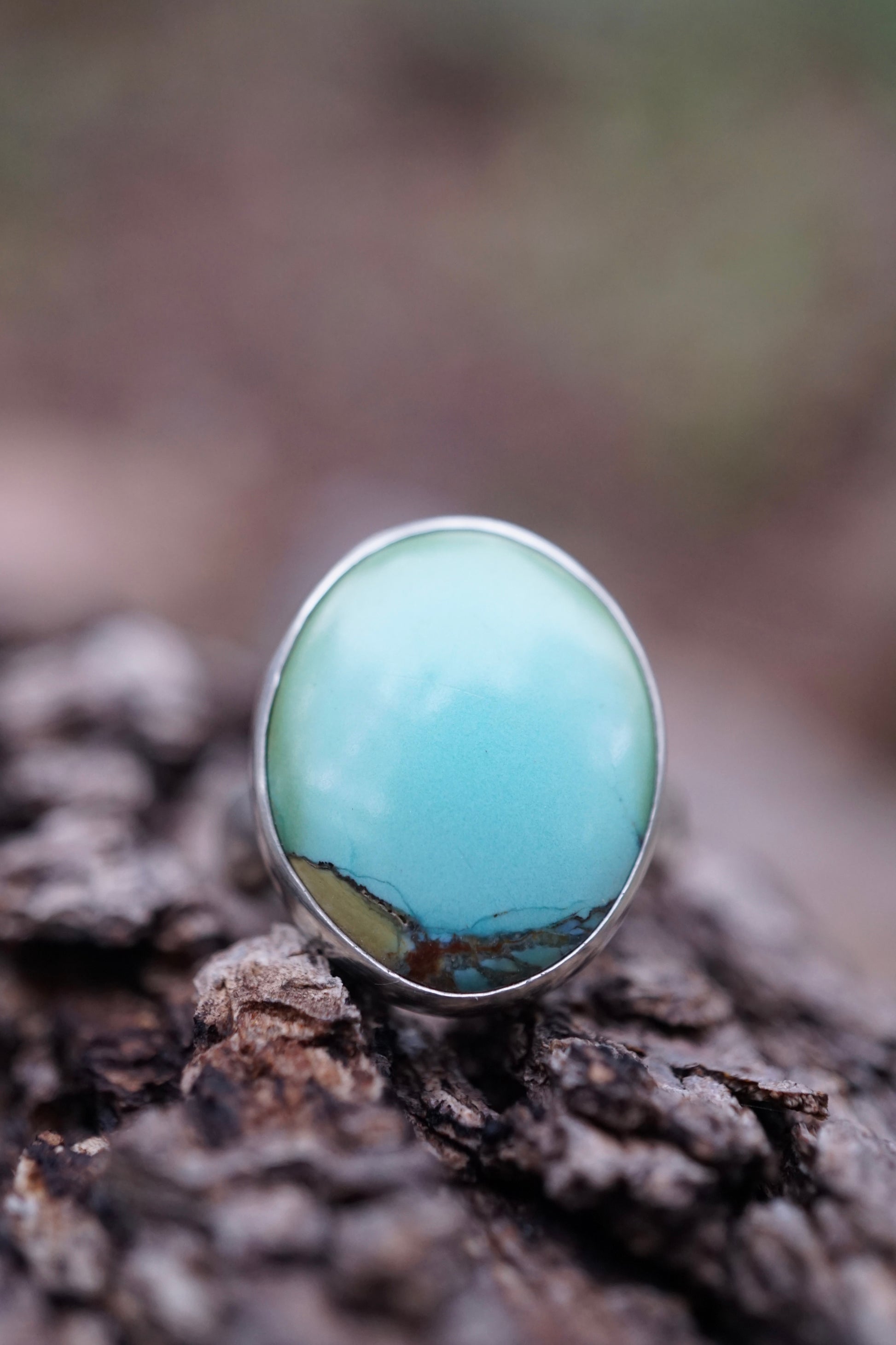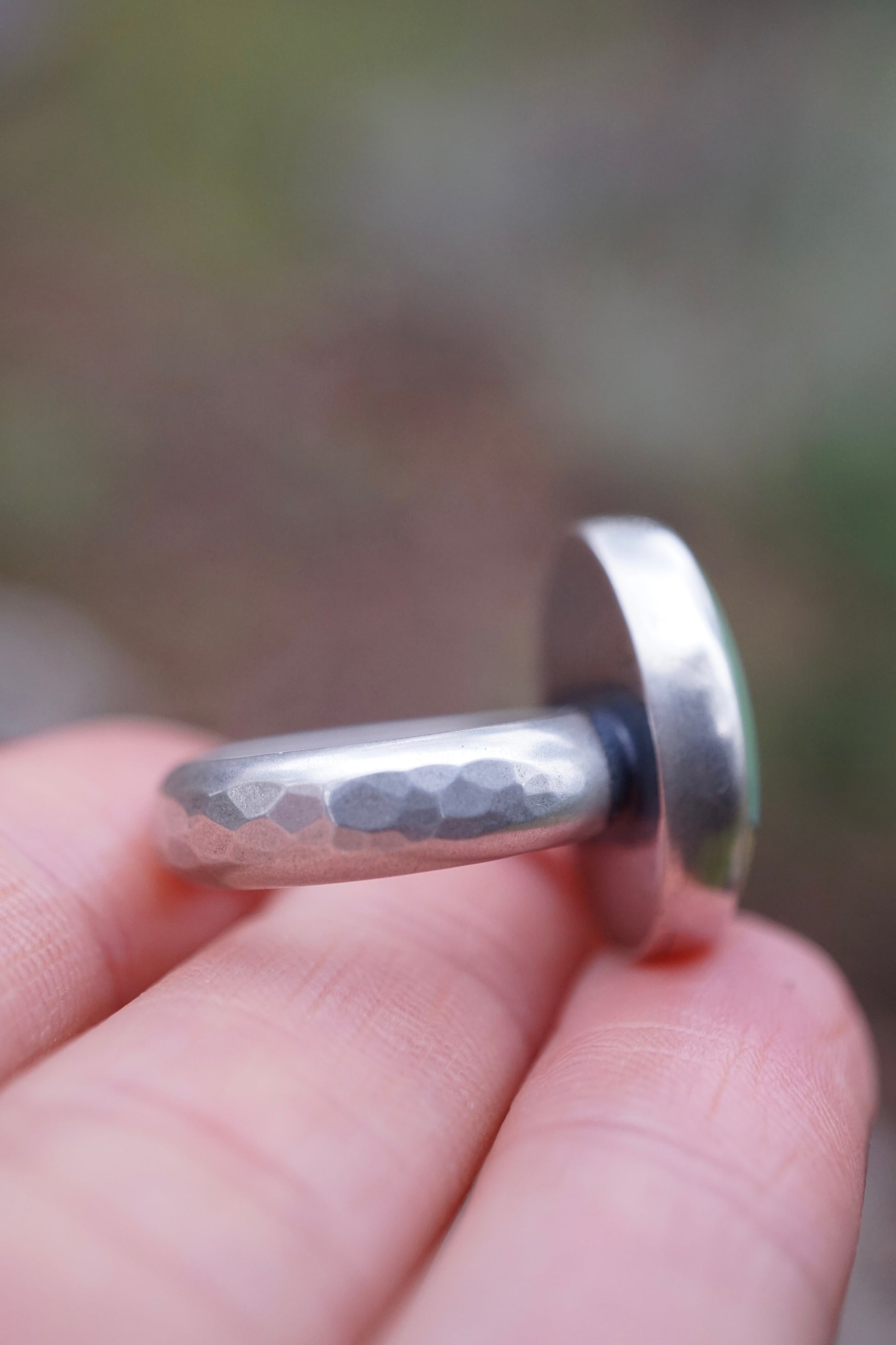 A hunk of sky blue turquoise set simply to let it glow. The band is hefty half round sterling with hammered texturing. This is Chinese turquoise. Made of sterling silver.